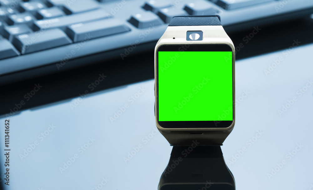 smartwatch near computer pc keyboard and mouse with chroma key green ...
