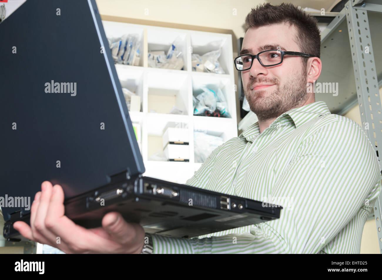 Technician working on laptop Stock Photo - Alamy