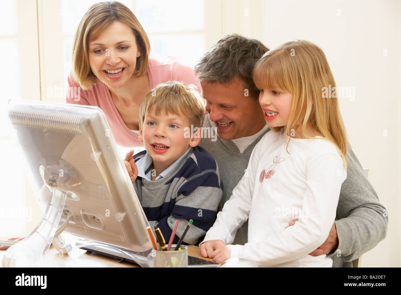 Family working on a computer and smiling Stock Photo - Alamy