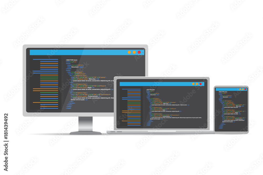 HTML code website. Laptop, desktop, tablet coding, programming concept ...