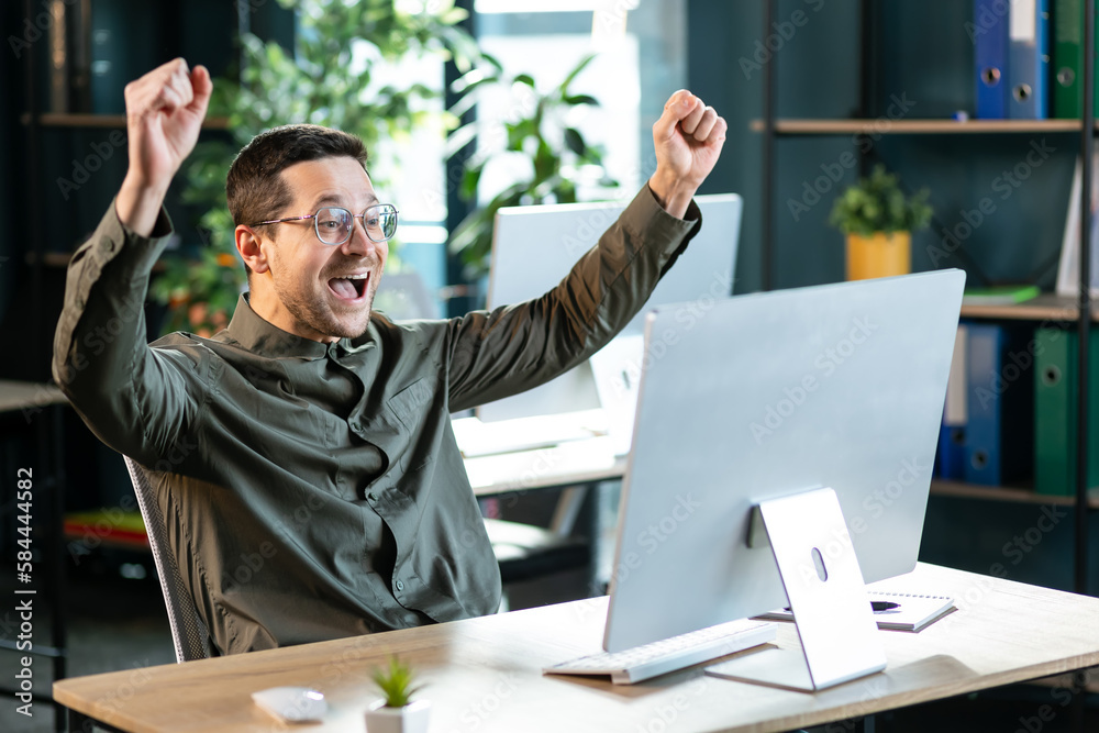Young guy making YES gesture in front of computer at office. Millennial ...