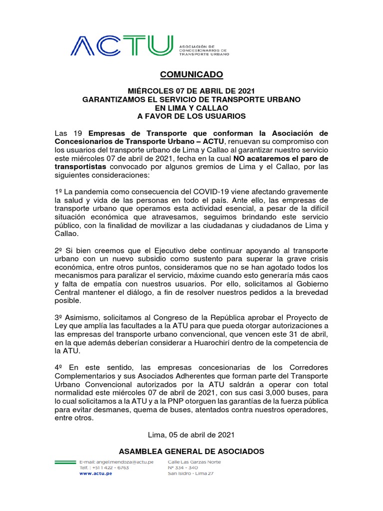 Comunicado Garantizamos Continuidad Del Servicios de Transporte Urbano ...