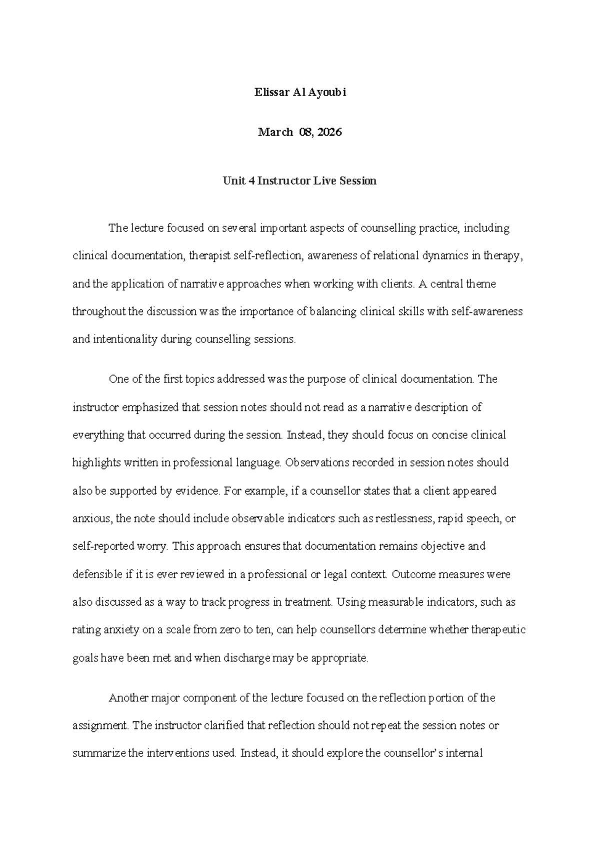 Unit 4 Live Session: Key Insights on Counselling Practice - Studocu