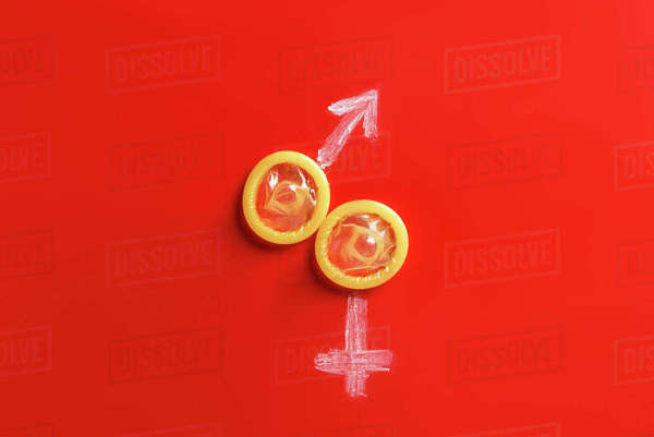 Top view of condoms with male and female signs on red background ...