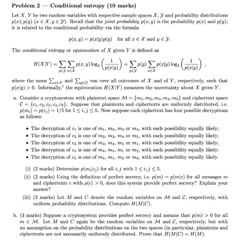 Solved Problem 2 - Conditional entropy (10 marks) Let X,Y be | Chegg.com