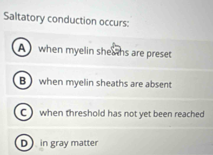 Solved: Saltatory conduction occurs: A when myelin sheahs are preset B ...