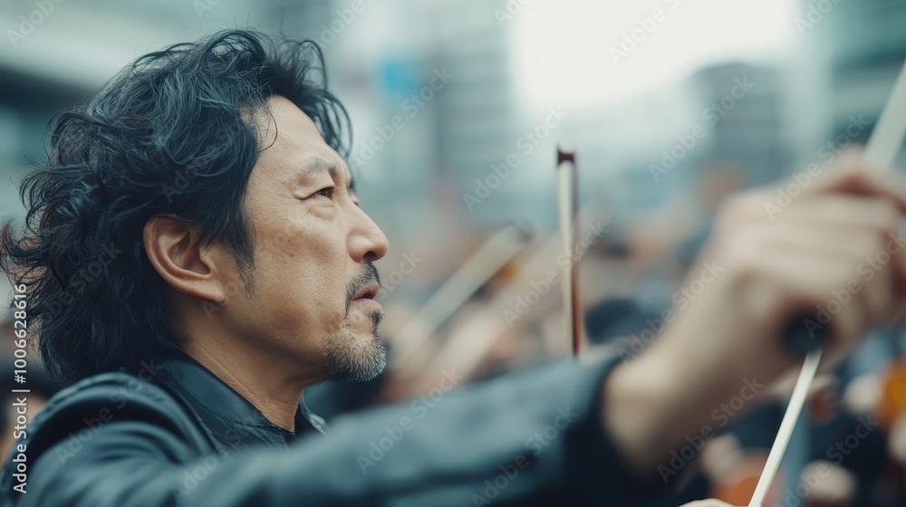 Captured in a side profile, the orchestra conductor displays intense ...