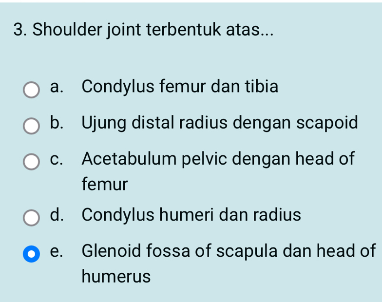 Telah dijawab:Shoulder joint terbentuk atas... a. Condylus femur dan ...