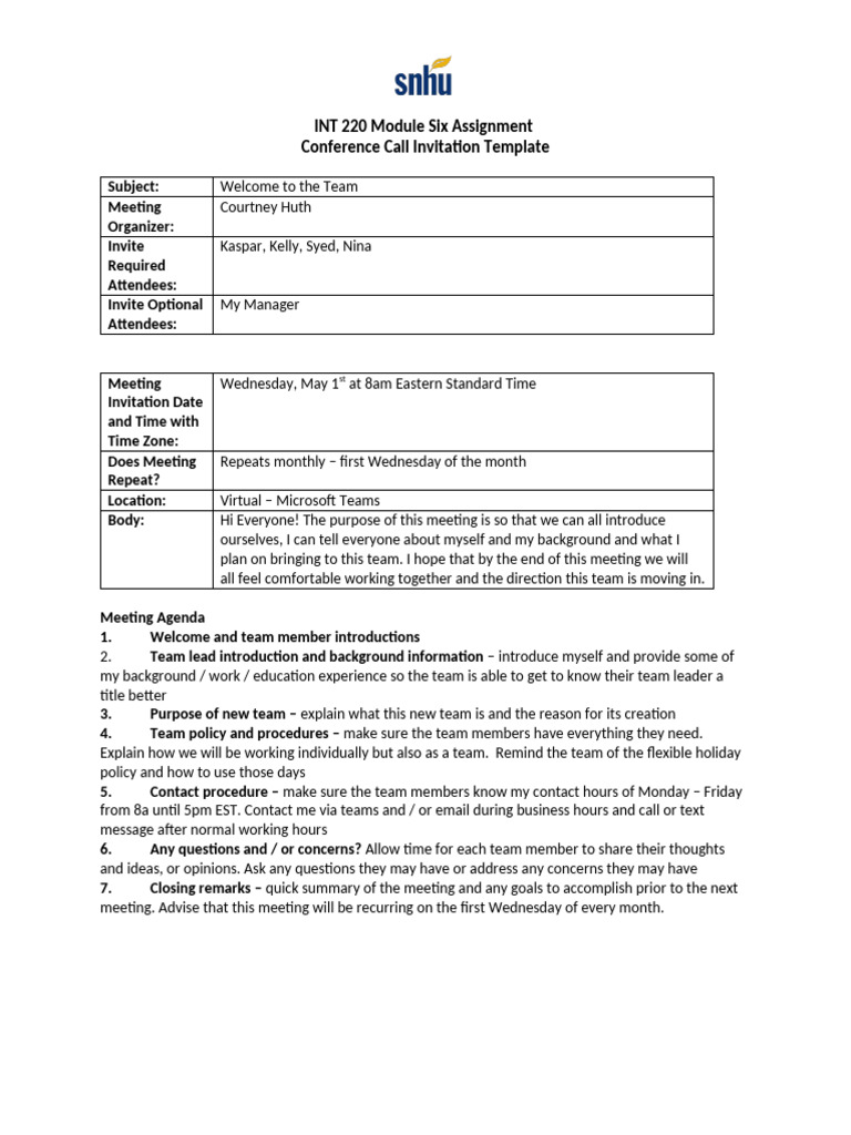 Conference Call Invitation - INT 220 Module Six Assignment Conference ...