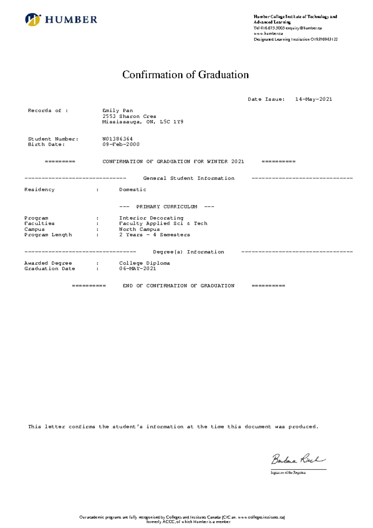 Confirmation of Graduation - Humber College Institute of Technology and ...