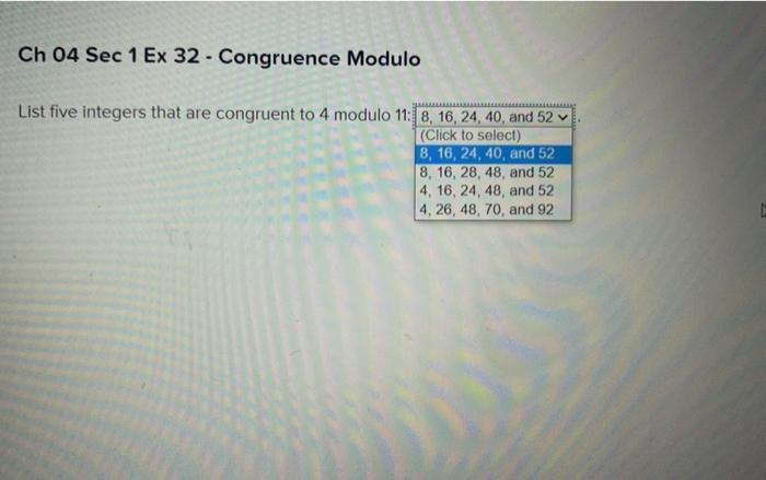 Solved Ch 04 Sec 1 Ex 32 - Congruence Modulo List five | Chegg.com