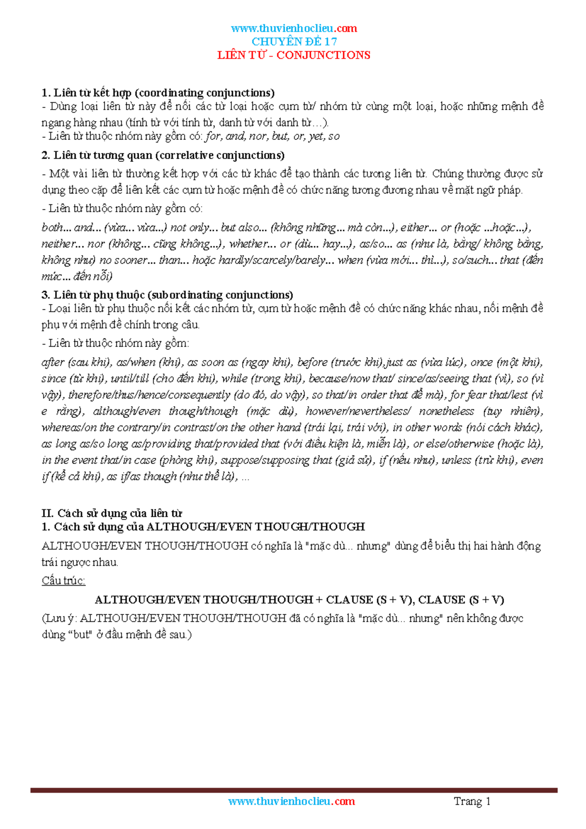 CHUYÊN ĐỀ 17: LIÊN TỪ (CONJUNCTIONS) - TÀI LIỆU HỮU ÍCH - Studocu