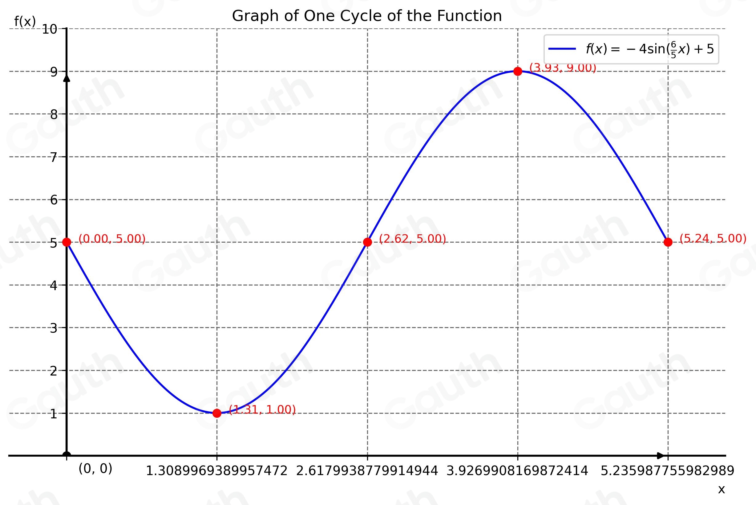 Solved: Graph exactly one cycle of the function f(x)=-4sin ( 6/5 x)+5 ...