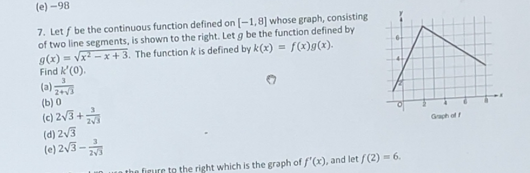 Solved: -98 7. Let f be the continuous function defined on [-1,8] whose ...