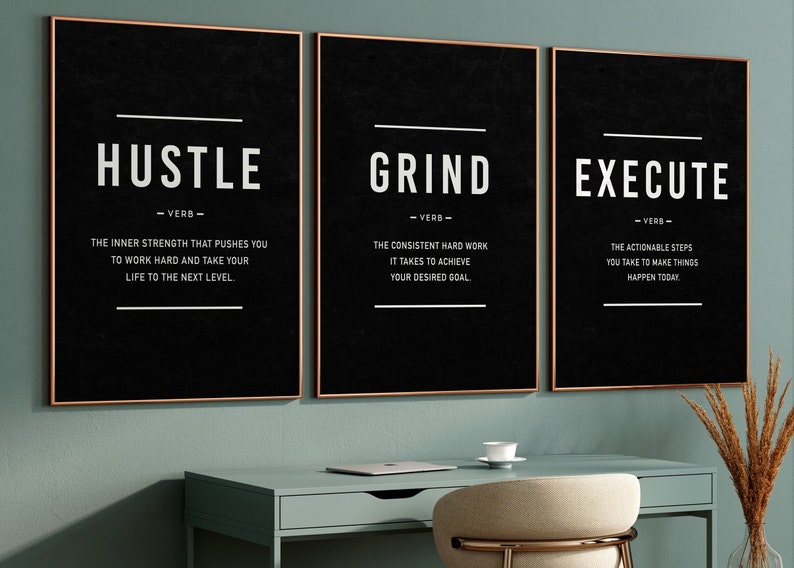 Motivational 3 Piece Set Wall Art, Hustle Grind Execute Prints ...