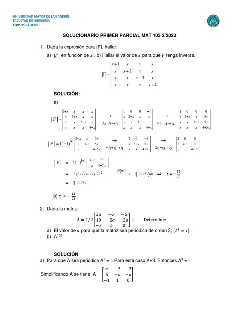 Solucionario MAT 103 Primer Parcial 2023 | PDF
