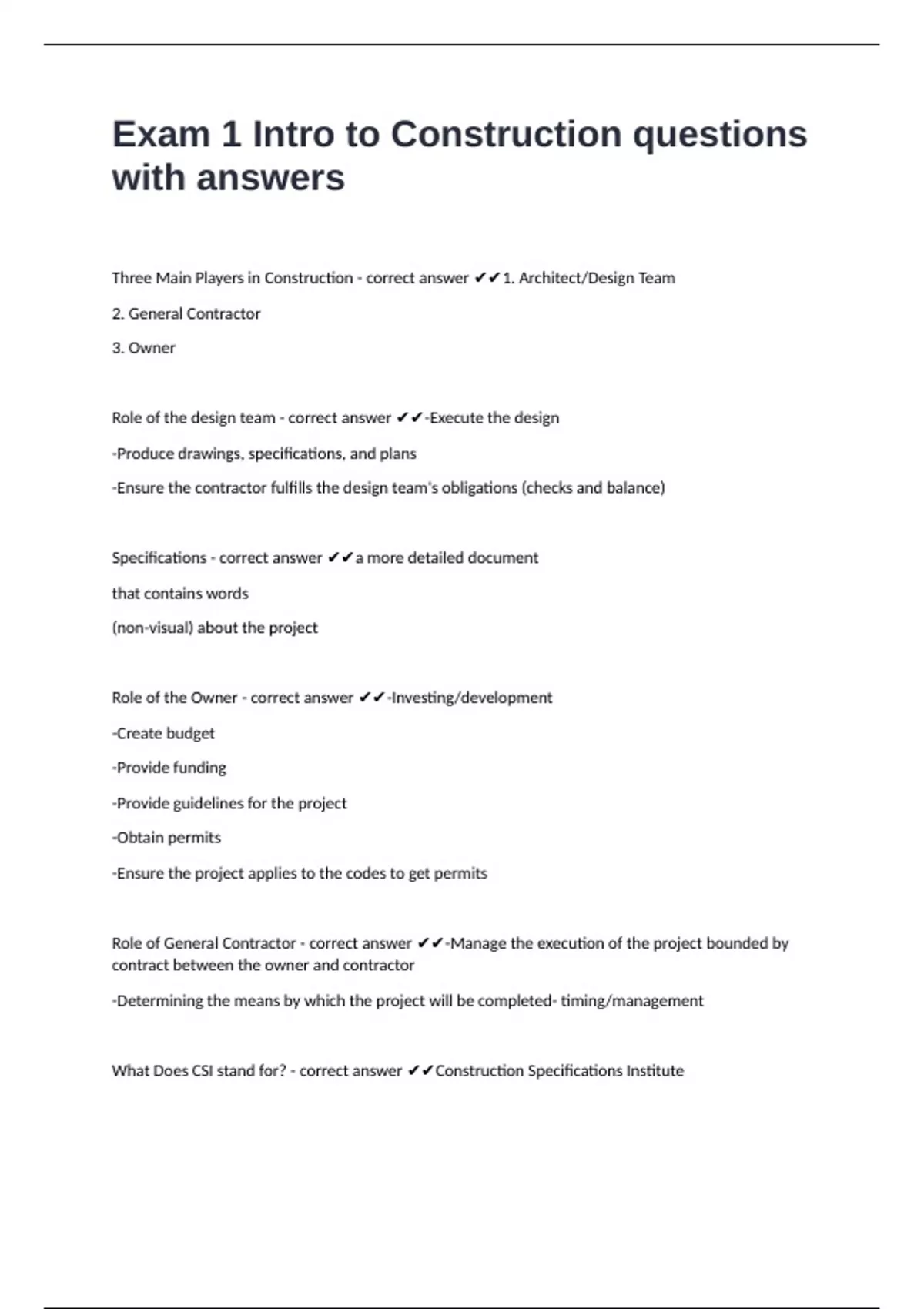 Exam 1 Intro to Construction questions with answers - Constructions ...