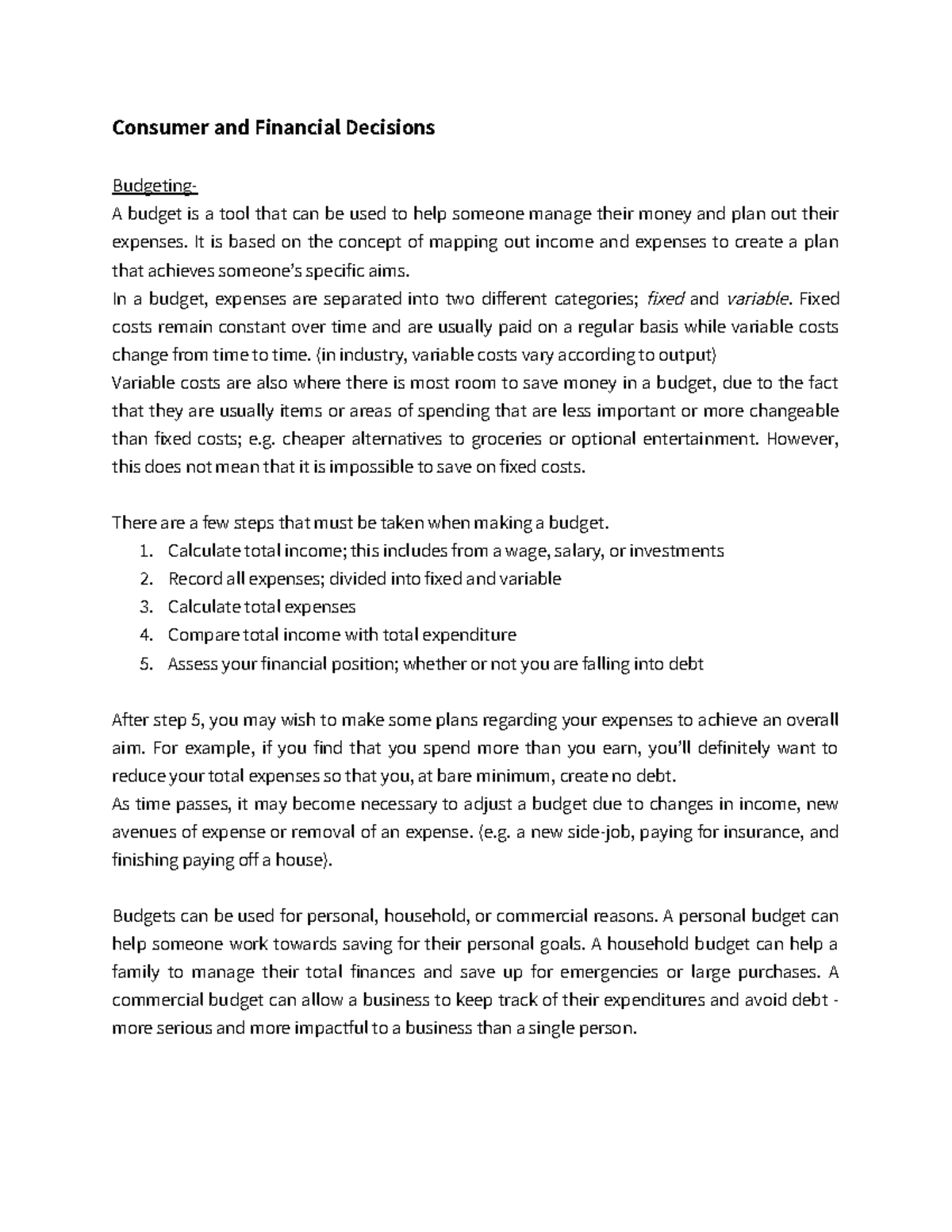 NSW Commerce Year 9: Consumer & Financial Decisions Overview - Studocu