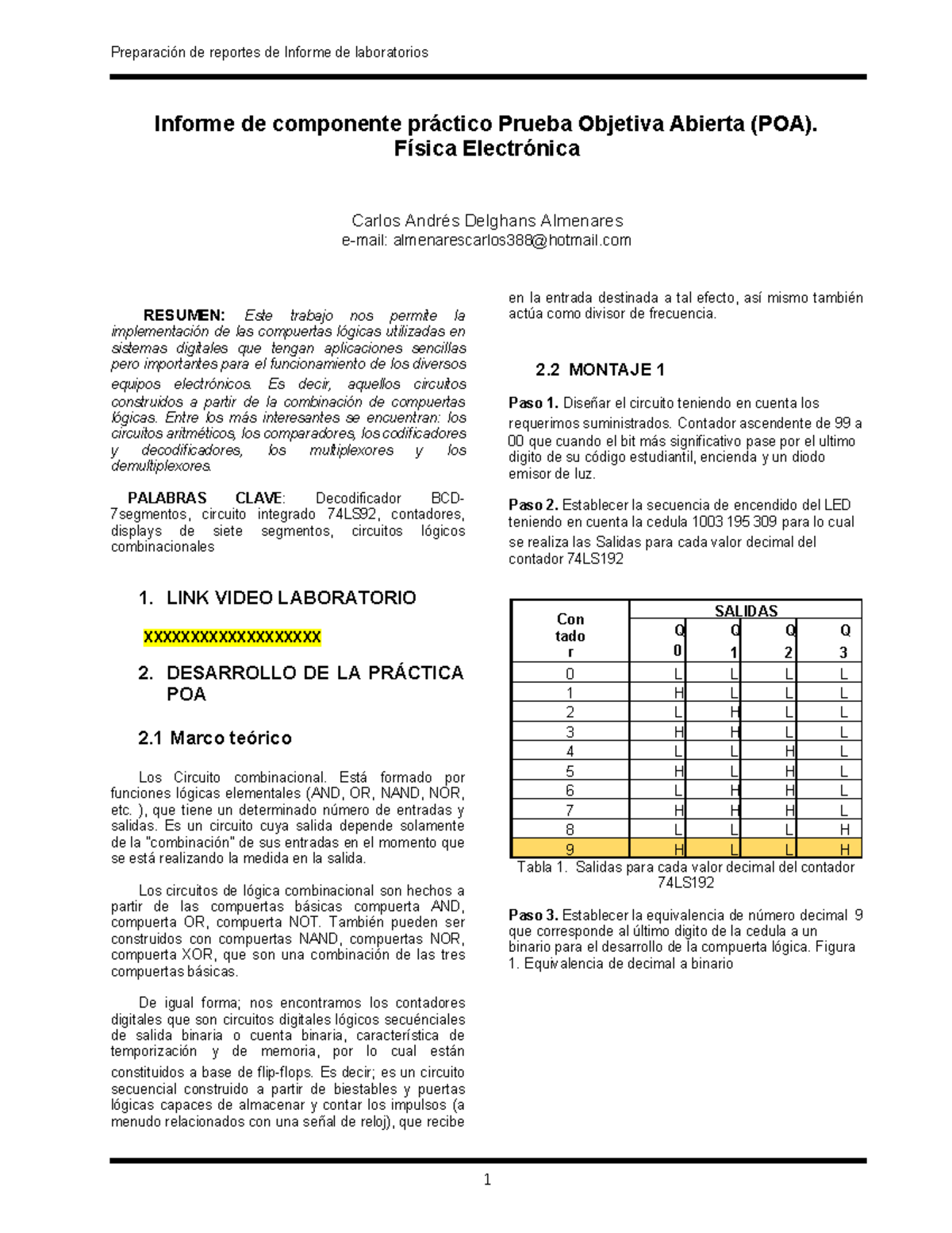 Informe de Laboratorio POA: Circuitos Lógicos y Compuertas 74LS92 - Studocu
