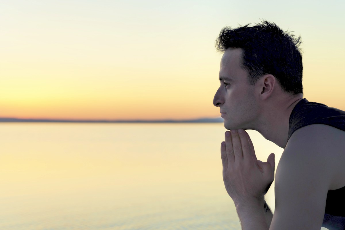 Man contemplating the sunset with a serene expression in a peaceful ...