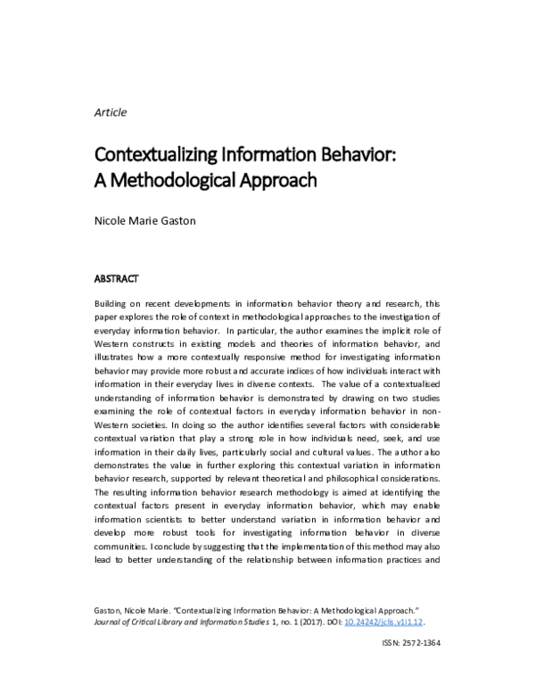 (PDF) Contextualizing Information Behavior: A Methodological Approach