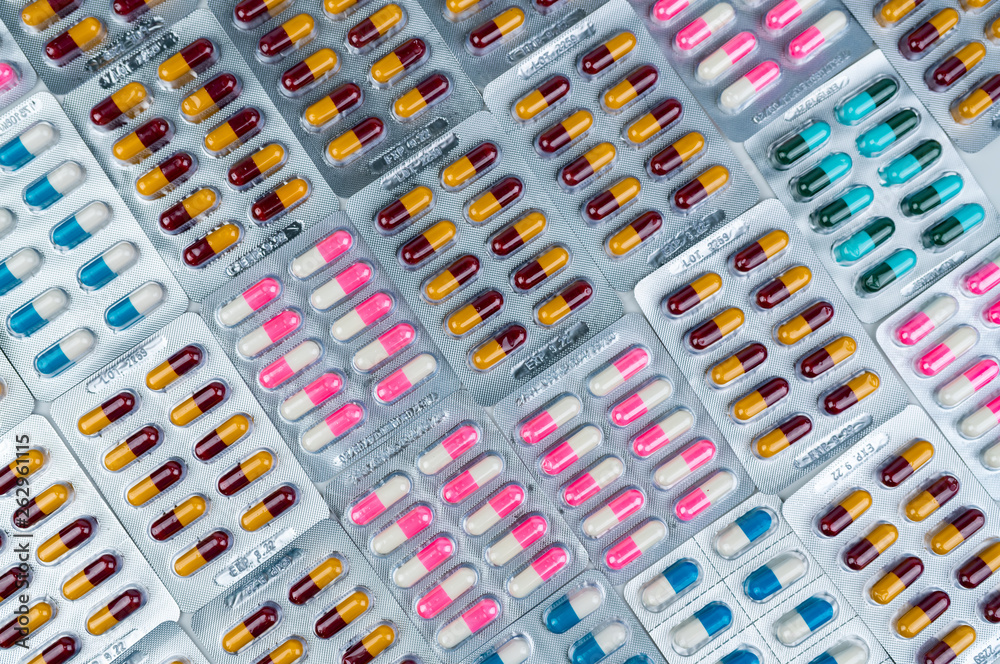Top view multi-colored antibiotic capsule pill in tray. Antibiotic drug ...