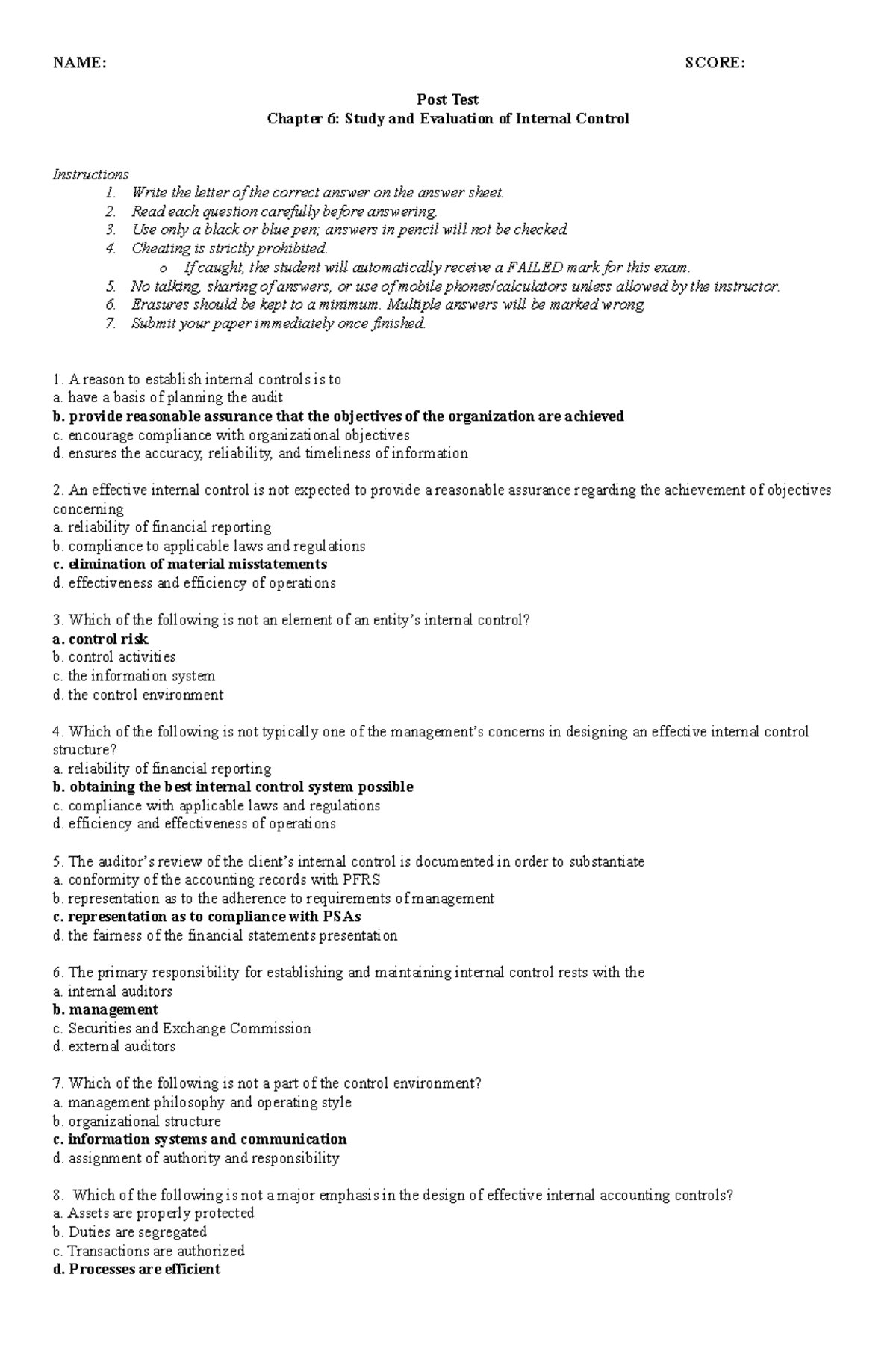AT Internal Control Post Test: Chapter 6 Study & Evaluation - Studocu
