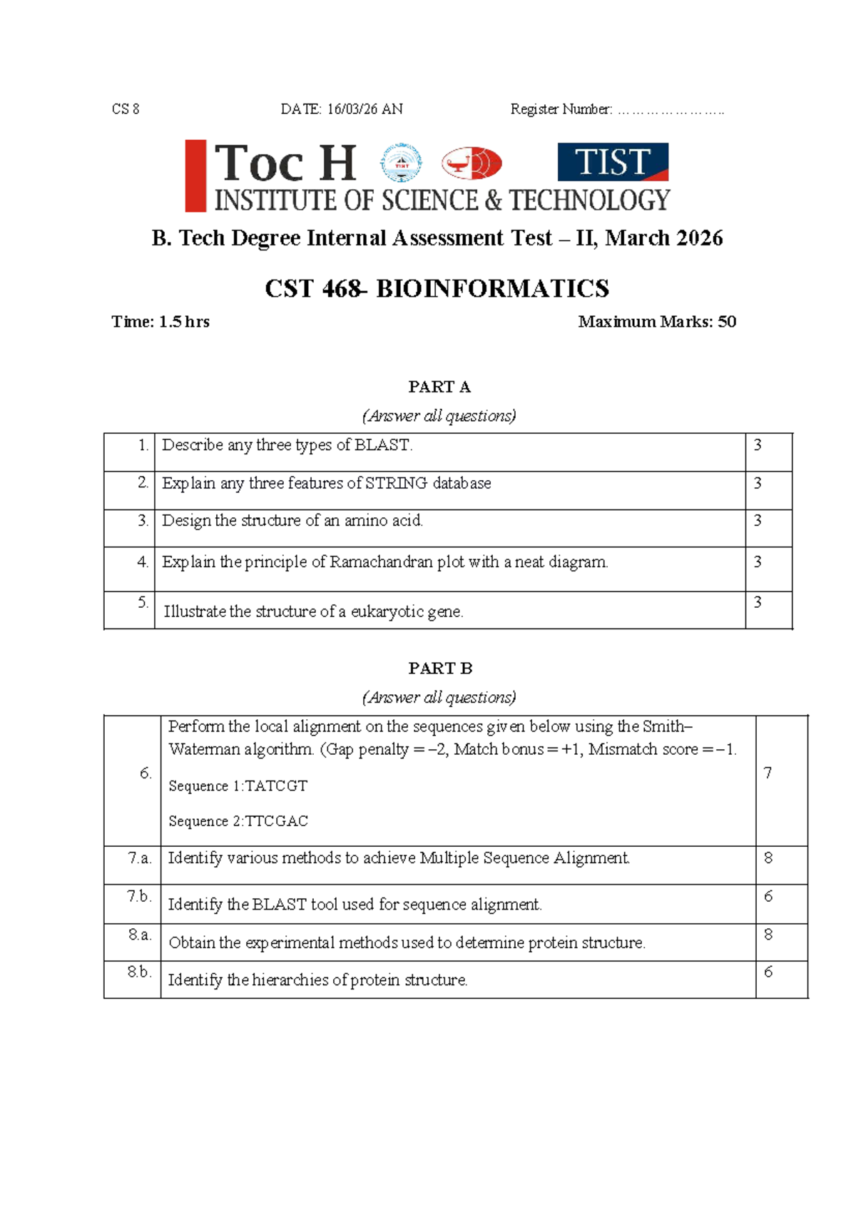 CS 8 Internal Assessment Test II: Bioinformatics QP - March 2026 - Studocu