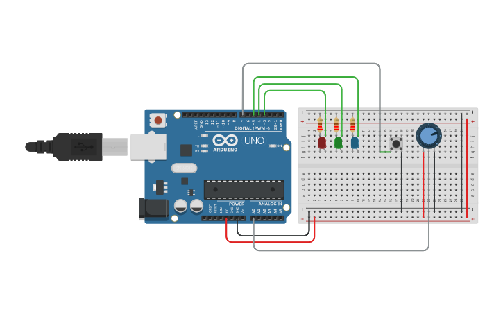 Circuit design Arduino 3LED Button Potenciometr | Tinkercad