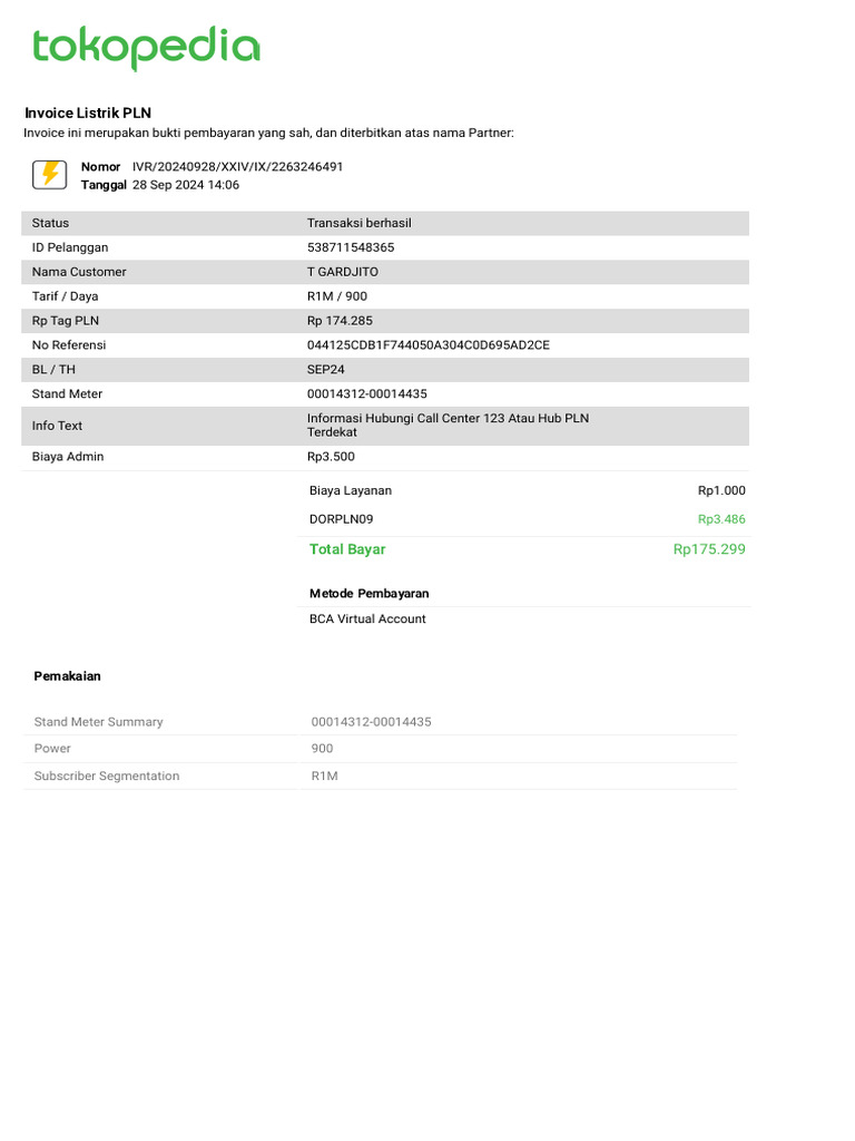 Invoice Listrik PLN Tanggal 28 Sep 2024 | PDF