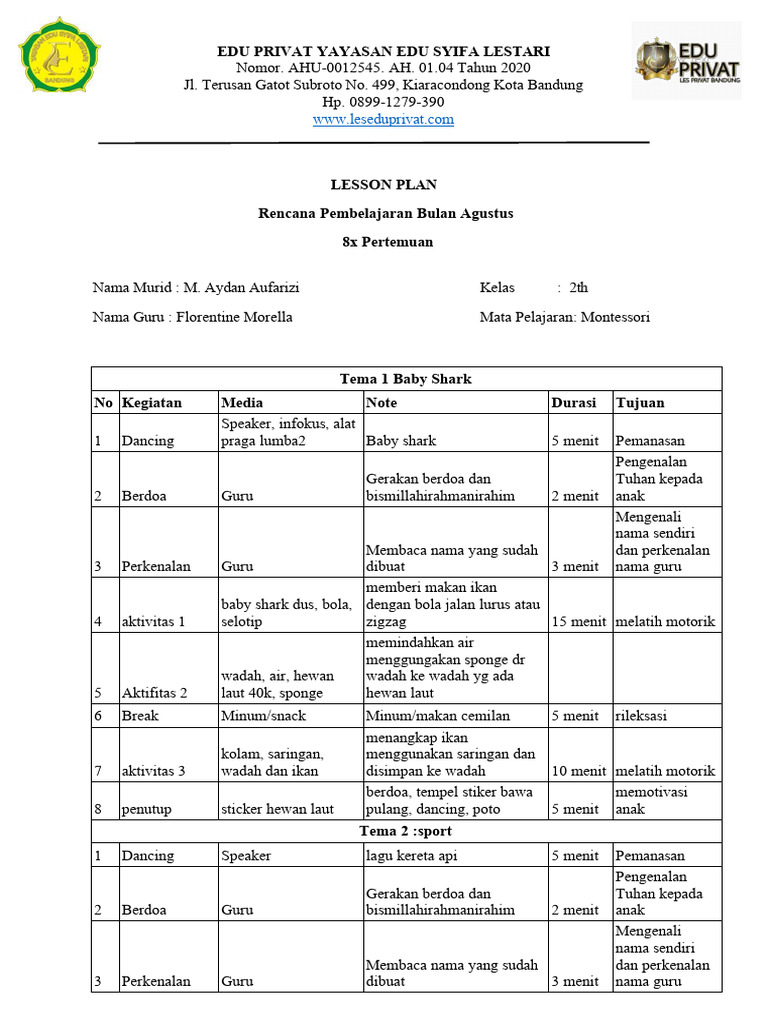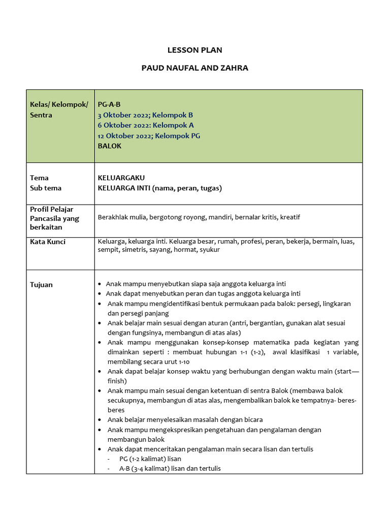 Contoh Template Lesson Plan Permata (Taska) | PDF
