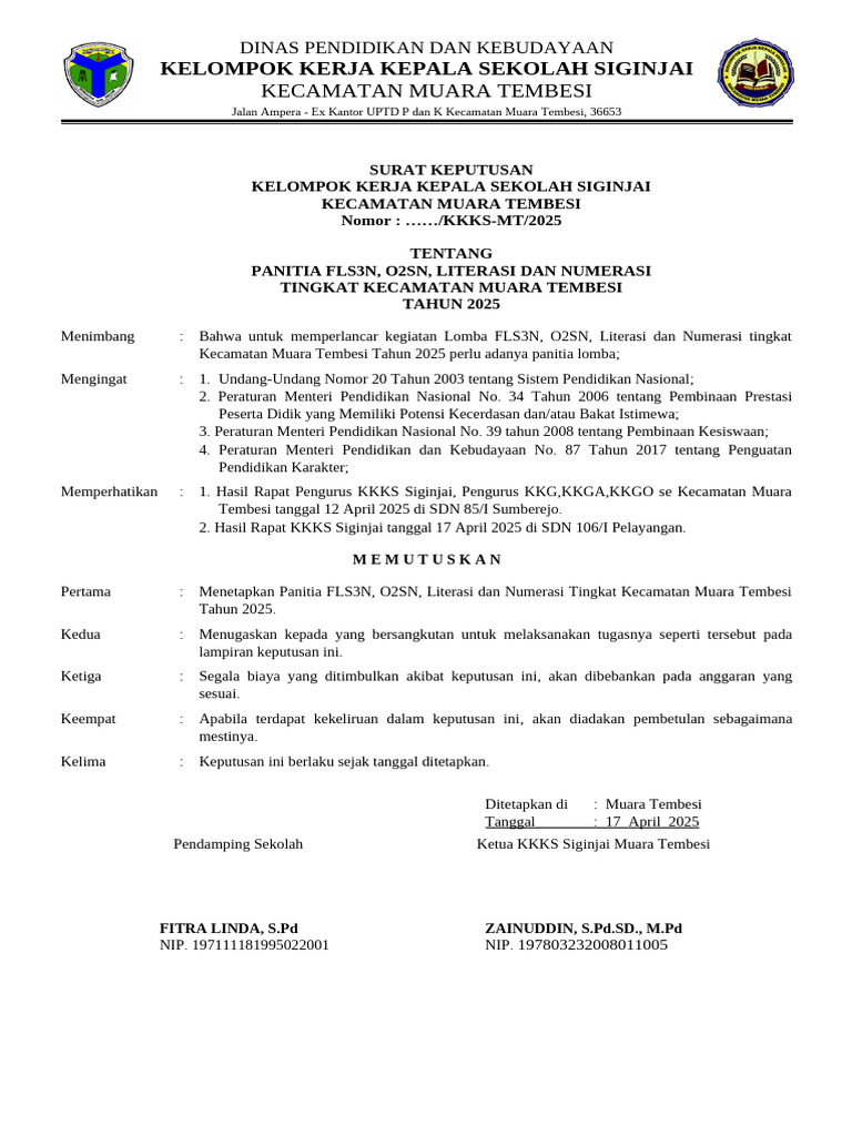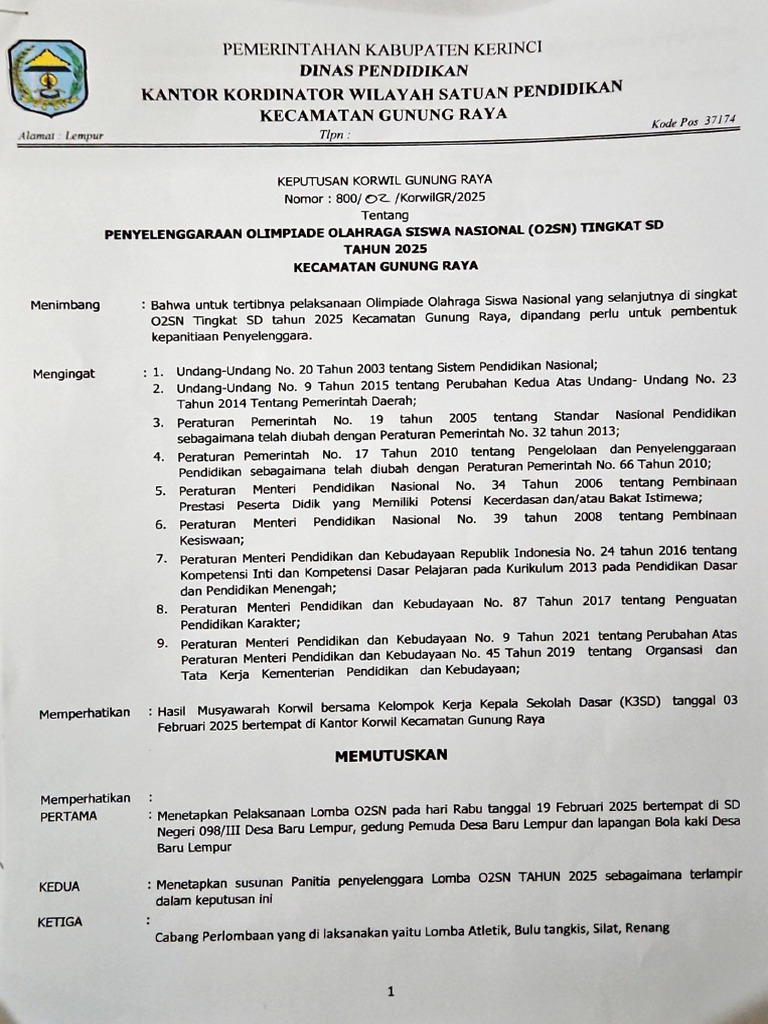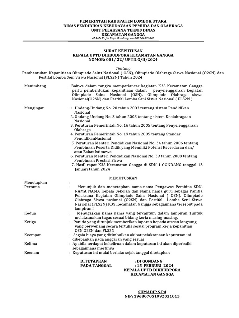 Contoh SK Panitia O2sn fls2n Tingkat Kecamatan | PDF