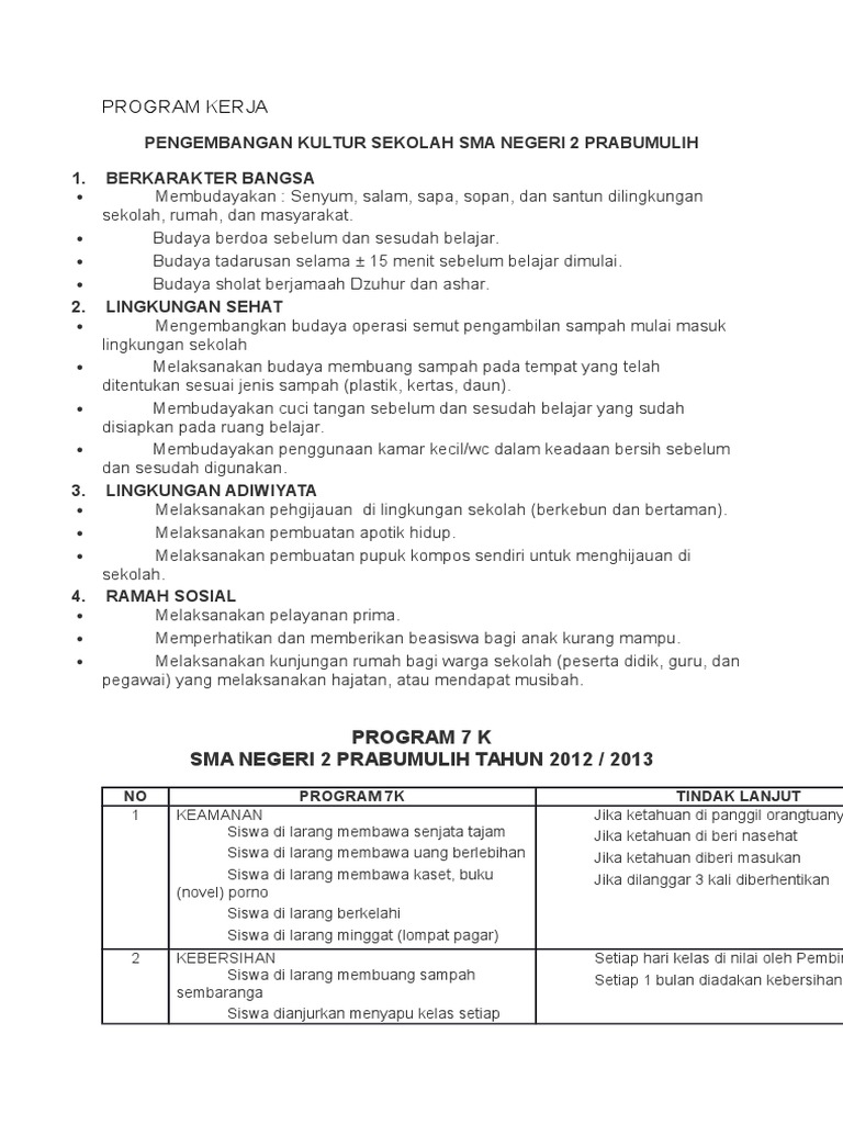 Program Kerja 7K di SMA Negeri 2 Prabumulih | PDF