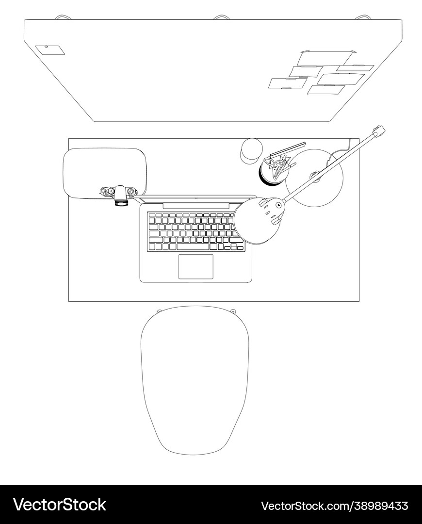 Contour of a workplace with a table, chair, laptop, lamp, flower and ...