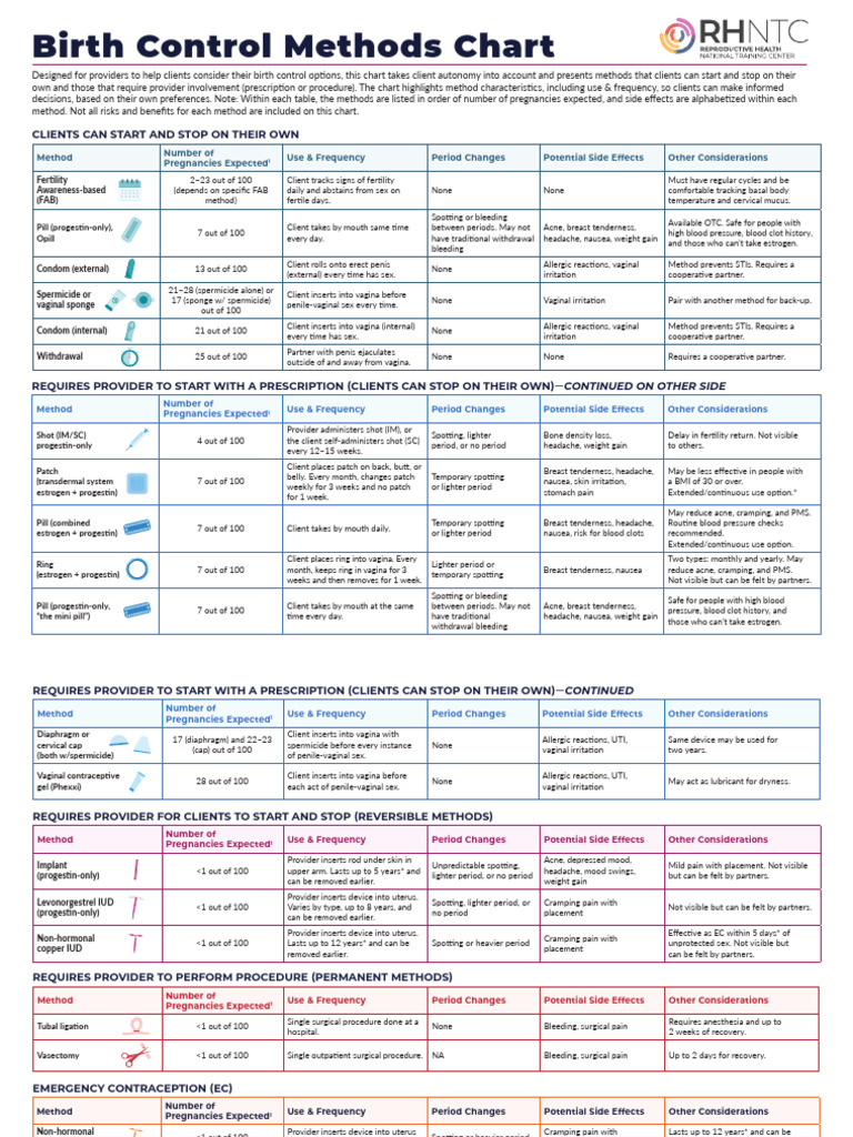 Birth Control Methods Chart | Reproductive Health National Training Center