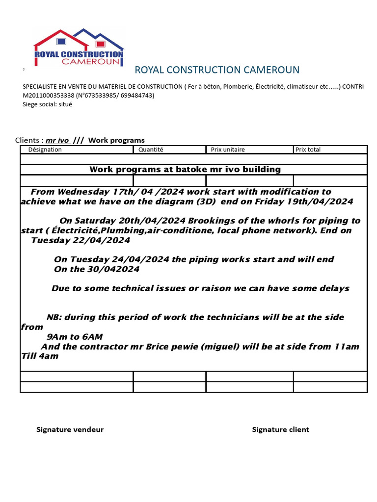 Royal Construction Cameroon Work Schedule | PDF