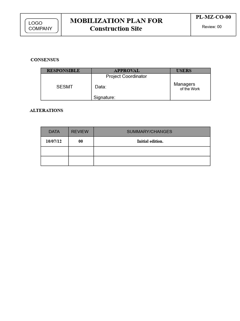 Mobilization Plan for Construction Project Excel Form - Fill Out and ...
