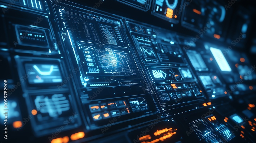 3D Glossy Control Room Background with Screens Displaying Operational ...