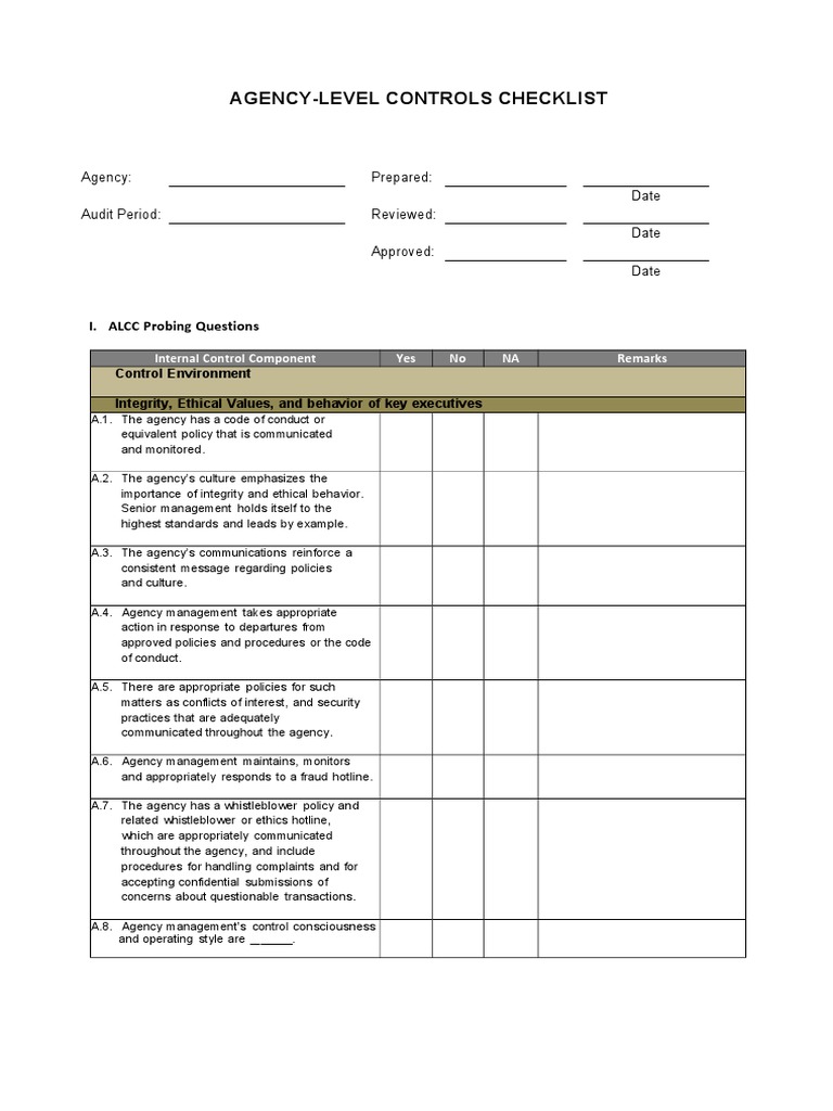 Internal Controls Checklist: Control Environment | Download Free PDF ...