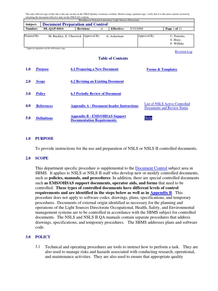 Document Control Showing Process Name Narrative Flow And Owner ...