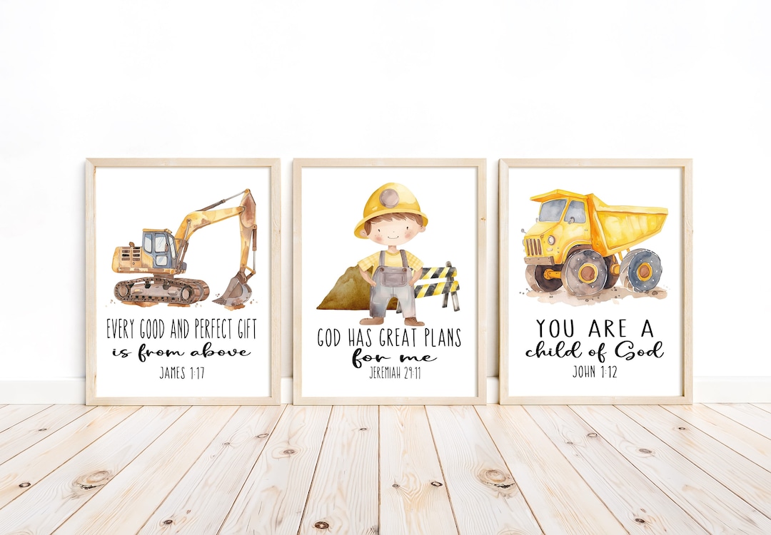 Construction Boy Christian Bible Verse Nursery Decor Set of 3 Unframed ...
