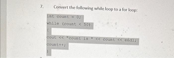 Solved 1. Convert the following while loop to for loop: int | Chegg.com