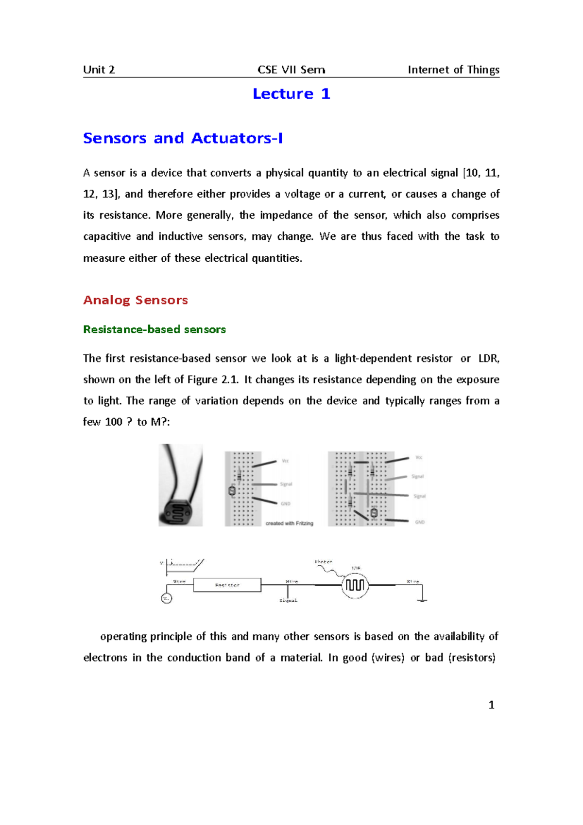 Unit 2 CSE VII Sem Internet of Things Lecture 1: Sensors Overview - Studocu
