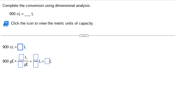 complete the conversion using dimensional analysis. 300cl= qquad l ...