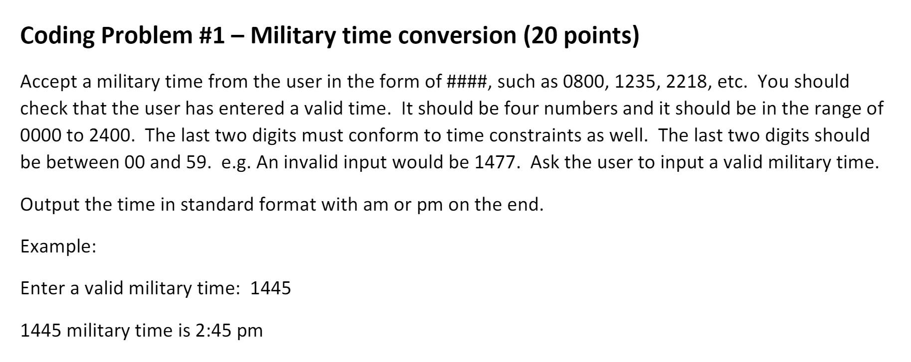 Solved Coding Problem #1 - Military time conversion (20 | Chegg.com