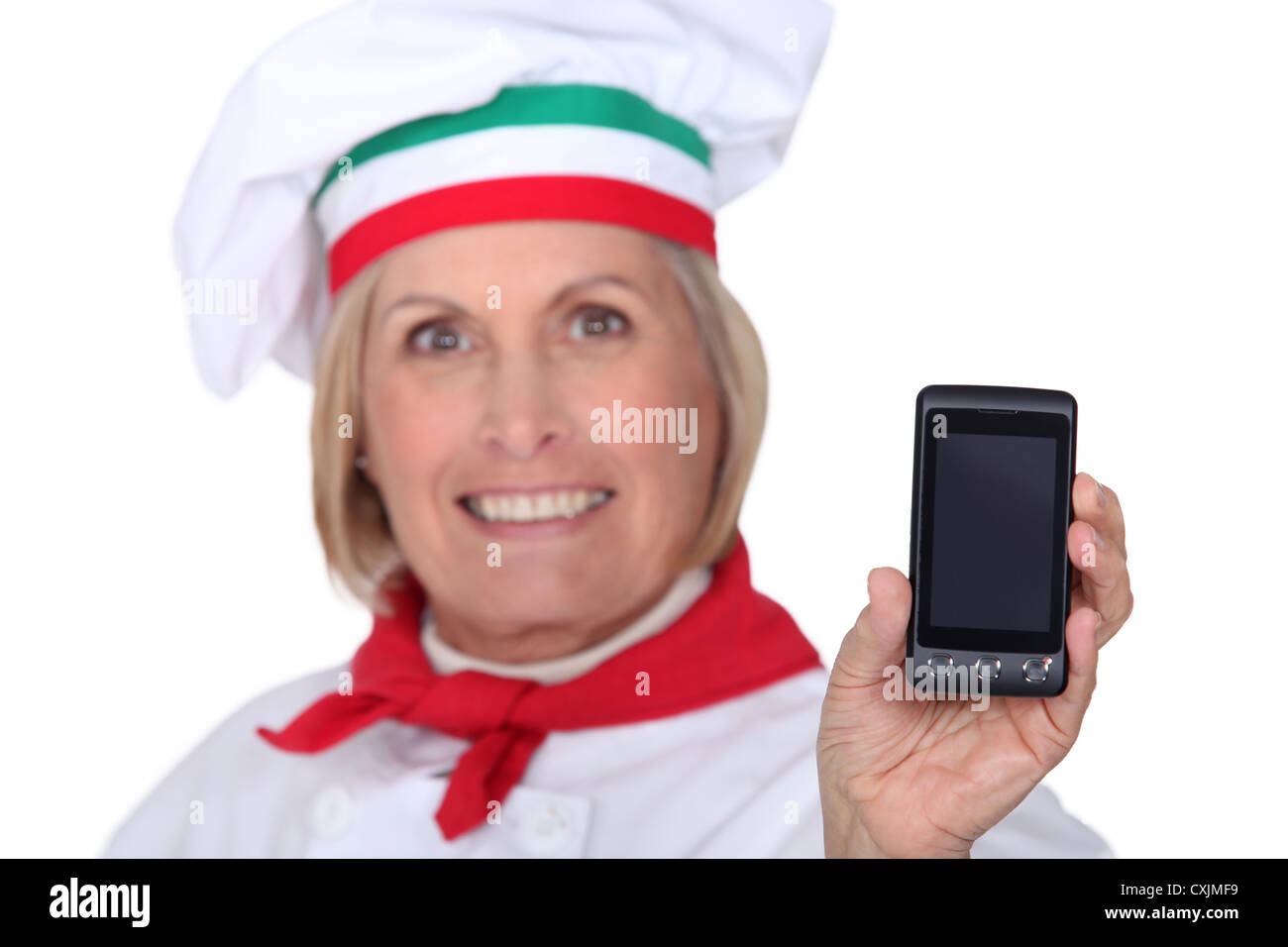 Smiling chef on smartphone screen: hire professionals online and cook ...