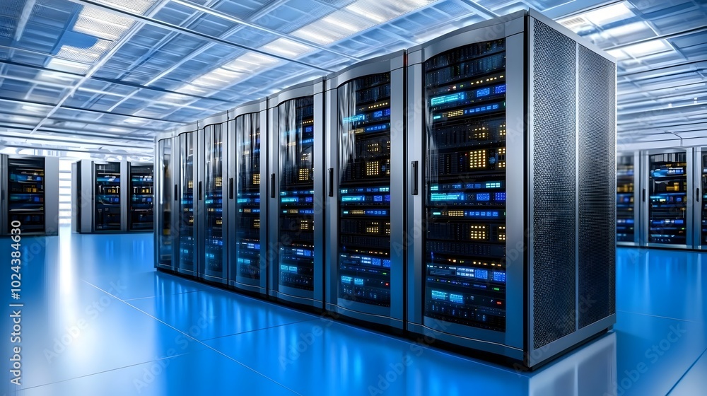 beautiful modern A server room filled with glowing servers, cool blue ...