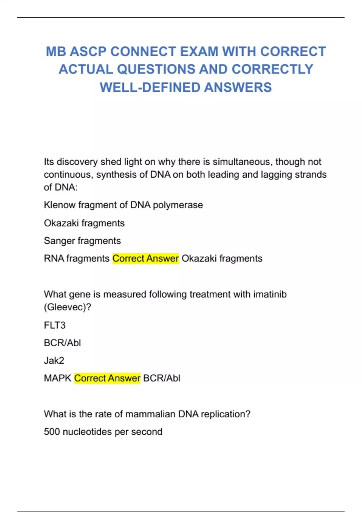 MB ASCP CONNECT EXAM WITH CORRECT ACTUAL QUESTIONS AND CORRECTLY WELL ...