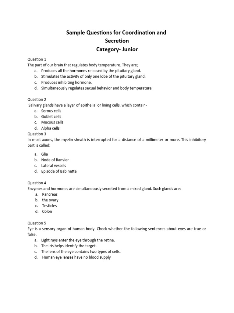 Sample Questions For Co-Ordination and Secretion Junior | PDF