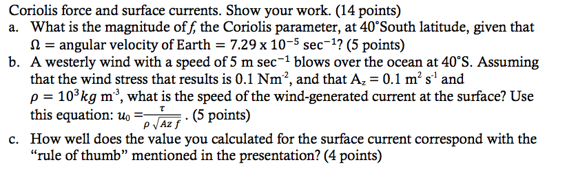 Solved Coriolis force and surface currents. Show your work. | Chegg.com